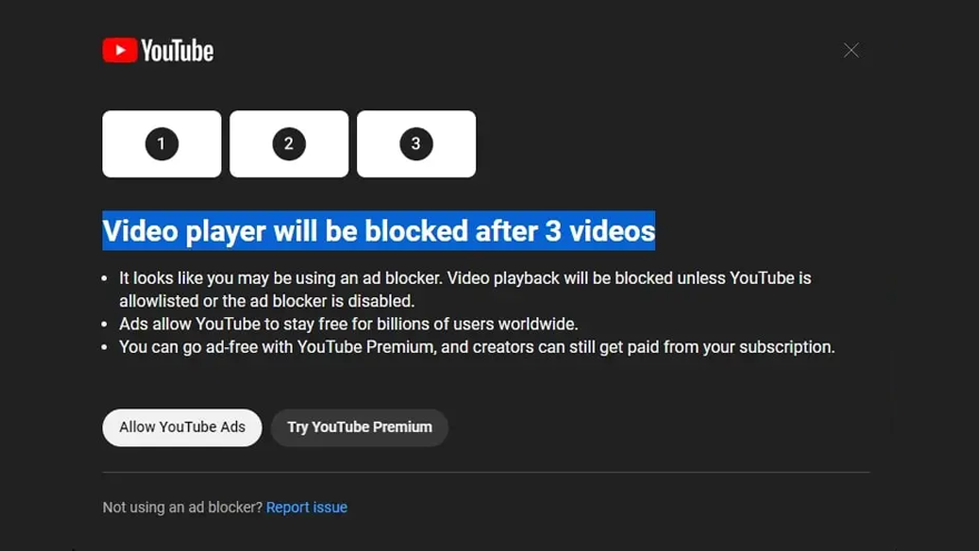 Những người bị ảnh hưởng sẽ được yêu cầu gỡ bỏ trình chặn quảng cáo hoặc mua đăng ký YouTube Premium nếu họ muốn tiếp tục xem video. Nếu không, họ sẽ thấy mình bị cắt sau khi xem ba video trên trang web.
