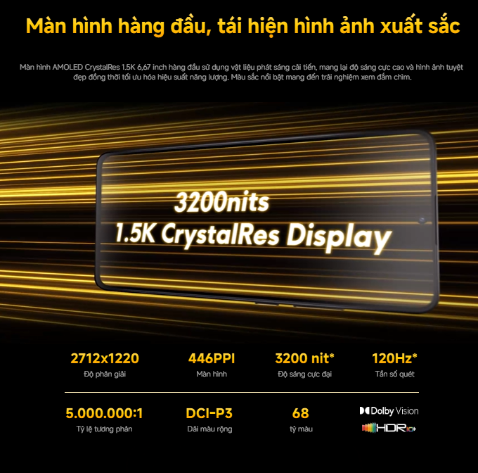 AMOLED, 68 tỷ màu, 120Hz, Dolby Vision, HDR10+, 700 nit (typ), 1400 nits (HBM), 3200 nits (peak) |
