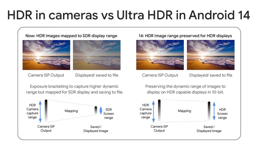 Một tính năng đáng chú ý trong bản cập nhật Android 14 Beta 2 là hỗ trợ hình ảnh Ultra HDR 10 bit, đem lại chất lượng màu sắc rực rỡ và độ tương phản được nâng cao. Phiên bản cập nhật này hoàn toàn tương thích với JPEG, cho phép hình ảnh có thể ở cả dải động tiêu chuẩn và chế độ HDR.