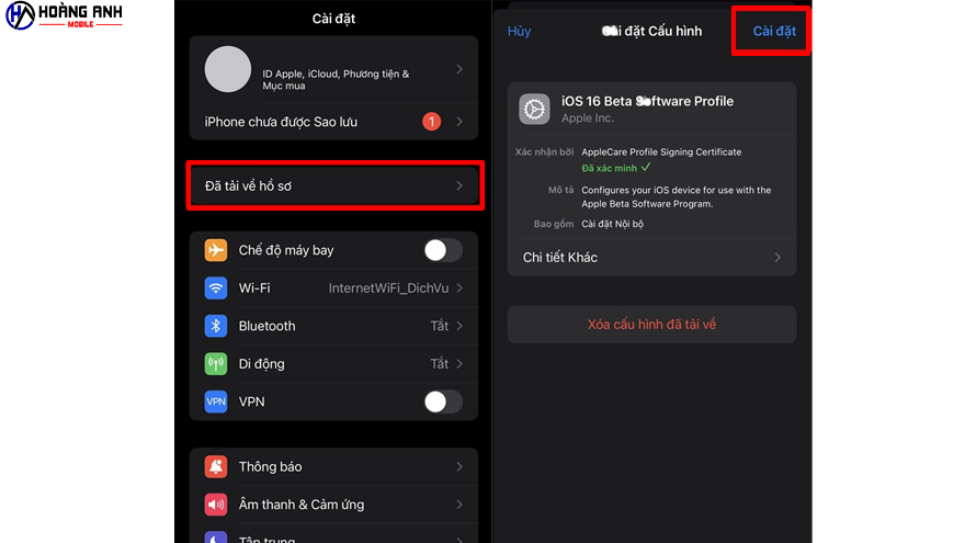 Sau đó bạn vào Cài đặt > Chọn Đã tải về hồ sơ > Cài đặt