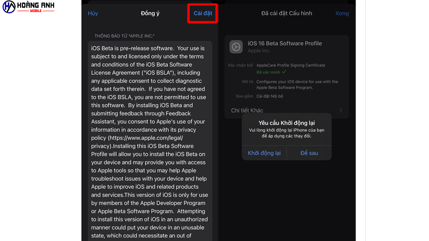 Đồng ý Cài đặt với các điều khoản từ Apple Inc. Sau đó khởi động lại máy.