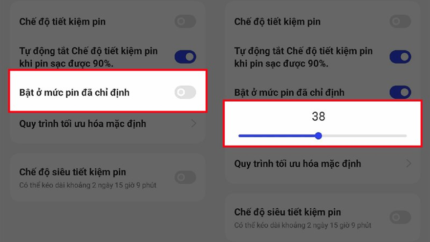 Bước 2: Tiếp theo, hãy tìm đến mục Bật ở mức pin đã chỉ định. Mở công tắc ở mục này lên rồi chọn mức pin mà mình mong muốn để kích hoạt tính năng này lên là xong.