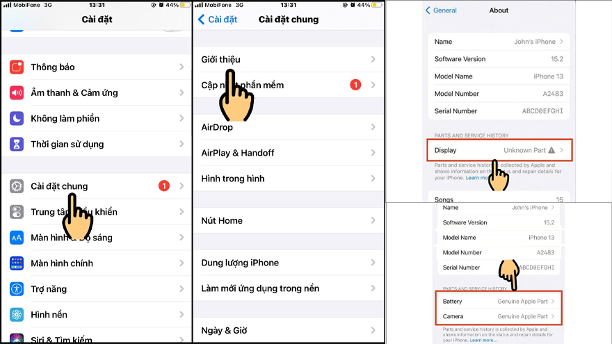 Vào phần Cài đặt>Cài đặt chung>Giới thiệu. Ở mục Parts & Service History. Có thể xem được linh kiện iPhone là hàng chính hãng hay đã bị thay chưa. Và linh kiện chính hãng hay linh kiện không xác định.