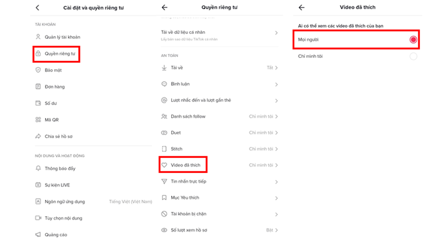 Bước 2: Chọn quyền riêng tư. Tiếp tục chọn Video đã thích. Chọn mọi người đổi thành chỉ mình tôi.