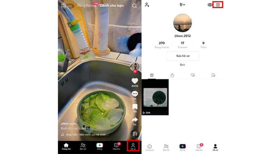Bước 1: Mở ứng dụng TikTok. Chọn vào phần hồ sơ cá nhân. Ấn tiếp biểu tượng Menu để mở bảng tùy chọn Chọn Cài đặt và Quyền riêng tư.