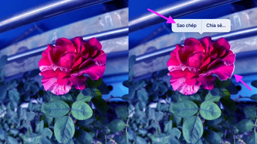 Bước 2: Mở ứng dụng Photo > Chọn ảnh cần tách > Bấm và giữ vật thể muốn tách nền đến khi xuất hiện tùy chọn Sao chép và Chia sẽ.