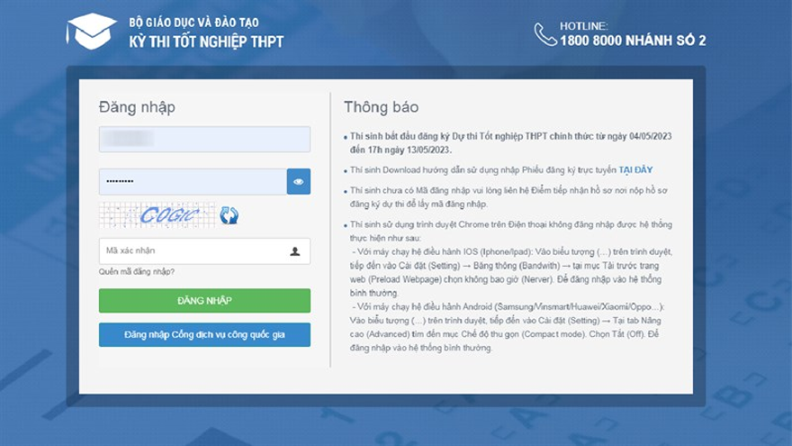 Trước khi dự thi, mỗi thí sinh sẽ được cấp một mã đăng nhập để có thể đăng nhập vào hệ thống để thực hiện các việc như đăng ký nguyện vọng hay xem điểm sau khi có kết quả.
