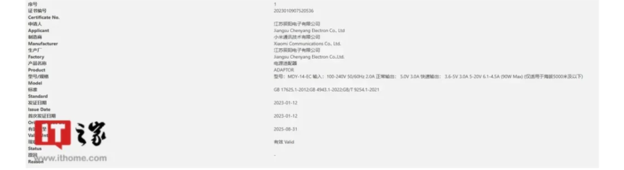 Bộ sạc 90W mới này xuất hiện dưới dạng “MDY-14-EC” trên chứng nhận 3C. Nó có các giá trị đầu ra là 5V/3A, 3.6V/5A, 5-20V/6.1-4.5A (Tối đa 90W).