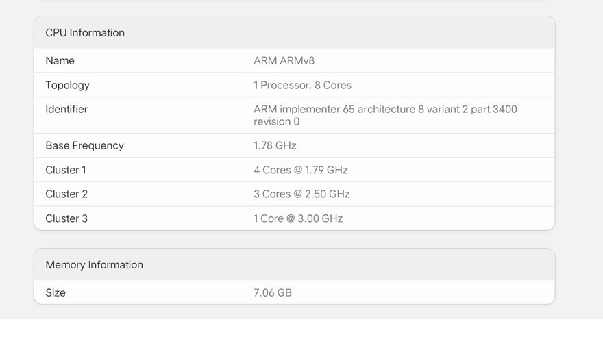 Theo như dữ liệu trên Geekbench, thiết bị này có o mạch chủ với mã là taro, nó bao gồm 4 nhân xung nhịp 1.79GHz, 3 nhân xung nhịp 2.50GHz và một nhân xung nhịp 3GHz. Ngoài ra, thiết bị còn sỡ hữu GPU Adreno 730. Đây chính là thông số của bộ vi xử lý Snapdragon 8+ Gen 1.