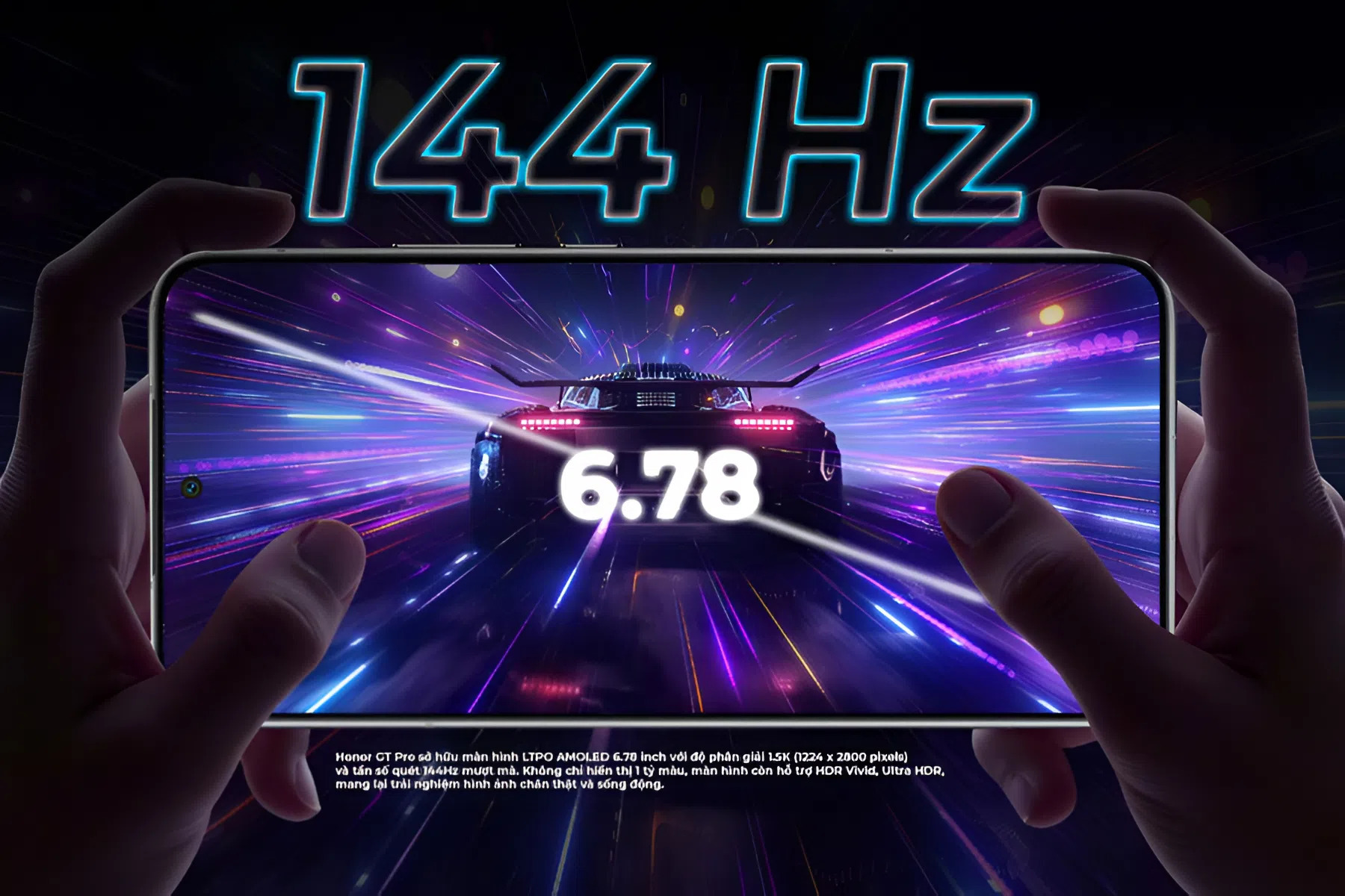 Honor GT Pro sở hữu màn hình LTPO AMOLED 6.78 inch với độ phân giải 1.5K (1224 x 2800 pixels) và tần số quét 144Hz mượt mà. Không chỉ hiển thị 1 tỷ màu, màn hình còn hỗ trợ HDR Vivid, Ultra HDR, mang lại trải nghiệm hình ảnh chân thật và sống động.