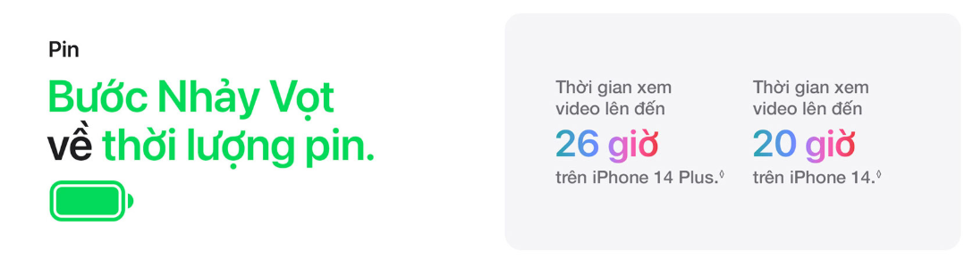 Với viên pin dung lượng 4325 mAh, iPhone 14 Plus mang lại thời lượng sử dụng vượt trội, đặc biệt khi so với các dòng iPhone 13 trở về trước. Chip A15 Bionic giúp tối ưu hiệu năng và tiết kiệm năng lượng, đảm bảo máy hoạt động liên tục suốt cả ngày dài mà không lo hết pin.