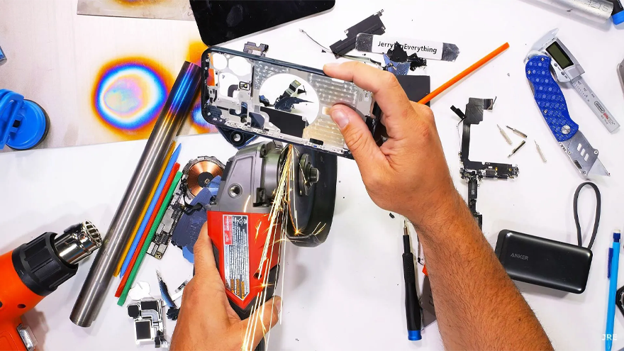Mới đây, kênh YouTube JerryRigEverything đã có màn mổ xẻ chiếc iPhone 15 Pro Max vừa ra mắt, để người dùng có cái nhìn rõ ràng hơn về loại vật liệu làm nên bộ khung của thiết bị này. Một chi tiết đáng chú ý của quá trình này là JerryRigEverything đã phải dùng đến một máy cưa cầm tay để cắt xuyên ngang bộ khung kim loại này thay vì dùng các dụng cụ thông thường.