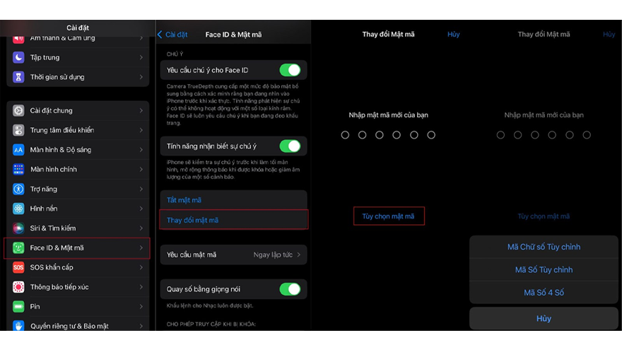 Bạn vào Face ID & Mật mã > nhập mật khẩu > chọn Thay đổi mật mã > nhập mật khẩu hiện tại > chọn Tùy chọn mật mã > chọn cho mình Mã Số Tùy chỉnh hoặc Mã Chữ số Tùy chỉnh để tăng độ bảo mật.