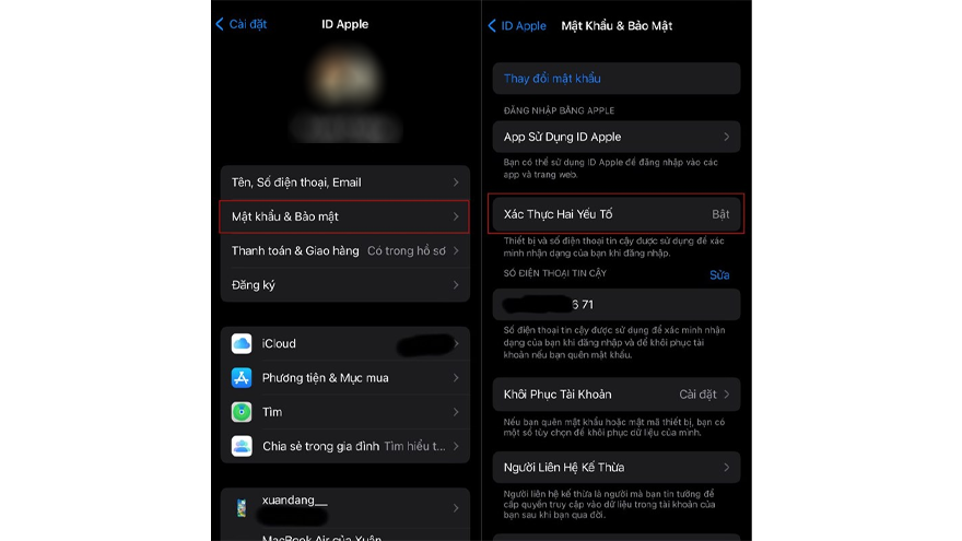 Bạn vào Cài đặt > ID Apple > Mật Khẩu & Bảo Mật > bật Xác thực Hai Yếu Tố > nhập số điện thoại nhận mã xác minh và làm theo các bước hướng dẫn cho đến khi hoàn tất.
