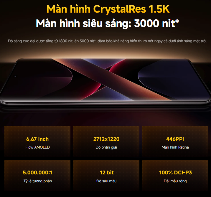 AMOLED, 68 tỷ màu, 120Hz, HDR10+, Dolby Vision, 1200 nits (HBM), 3000 nits (peak) |