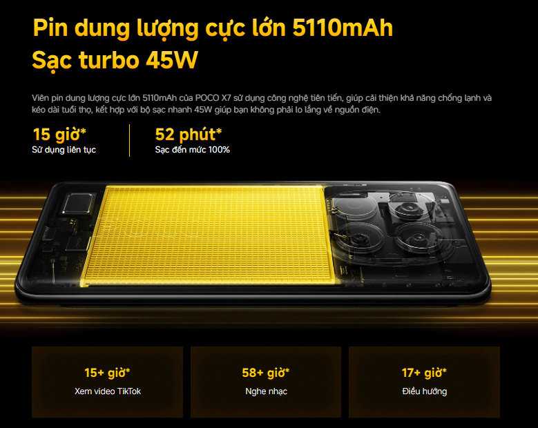 POCO X7 sở hữu viên pin 5110mAh, dư sức dùng cả ngày với các tác vụ nặng. Kèm theo đó là sạc nhanh Turbo 45W, có thể sạc đầy 100% chỉ trong 52 phút – củ sạc được tặng kèm sẵn trong hộp.