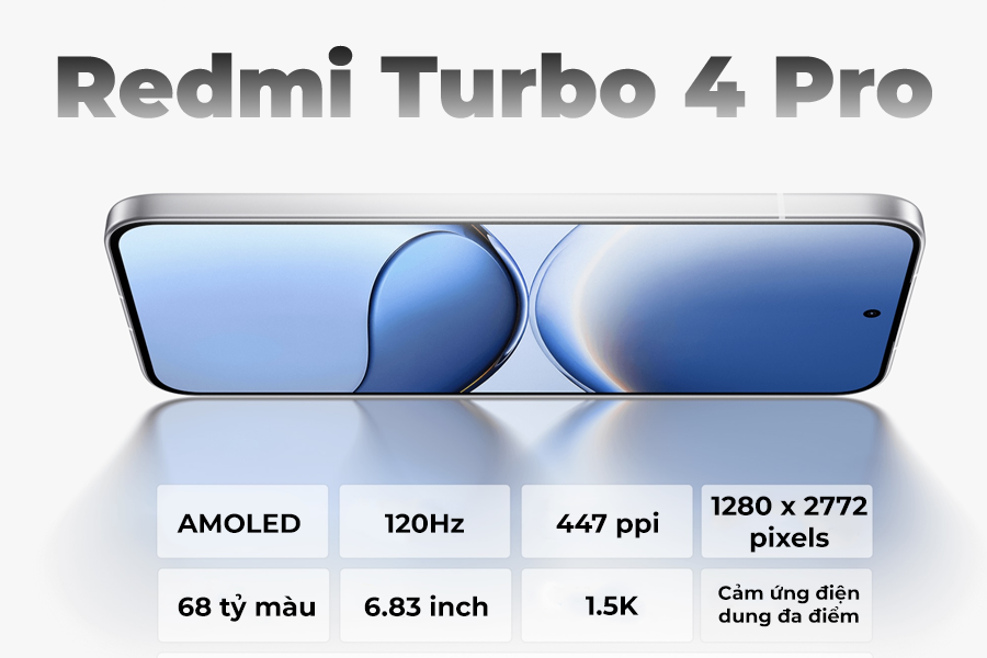 Redmi Turbo 4 Pro sở hữu màn hình AMOLED 6.83 inch, độ phân giải 1.5K (1280 x 2772 pixels), tỷ lệ 19.5:9 và mật độ điểm ảnh ~447 ppi – cho hình ảnh chi tiết, sắc nét.