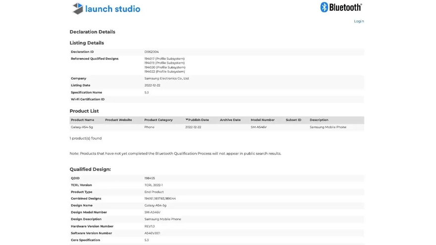 Điện thoại thông minh Samsung Galaxy A54 5G sắp ra mắt đã được phát hiện trên trang web chứng nhận Bluetooth SIG trước khi ra mắt chính thức.