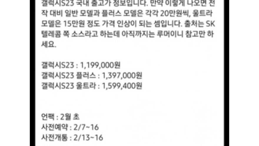 Giá bán đồn đại tại Hàn Quốc cho Samsung Galaxy S23, Galaxy S23+ và Galaxy S23 Ultra đã được chia sẻ trên Twitter. Người ta cho rằng giá đến từ SKTelecom của Hàn Quốc, nhưng nó cũng có thể là công việc của một người nào đó ngẫu nhiên, vì vậy cần phải thận trọng với các chi tiết. Nếu giá Samsung Galaxy S23 là đúng, thì đó sẽ là một mức tăng giá được mong đợi khi xem xét các thông số kỹ thuật được cho là nâng cấp: