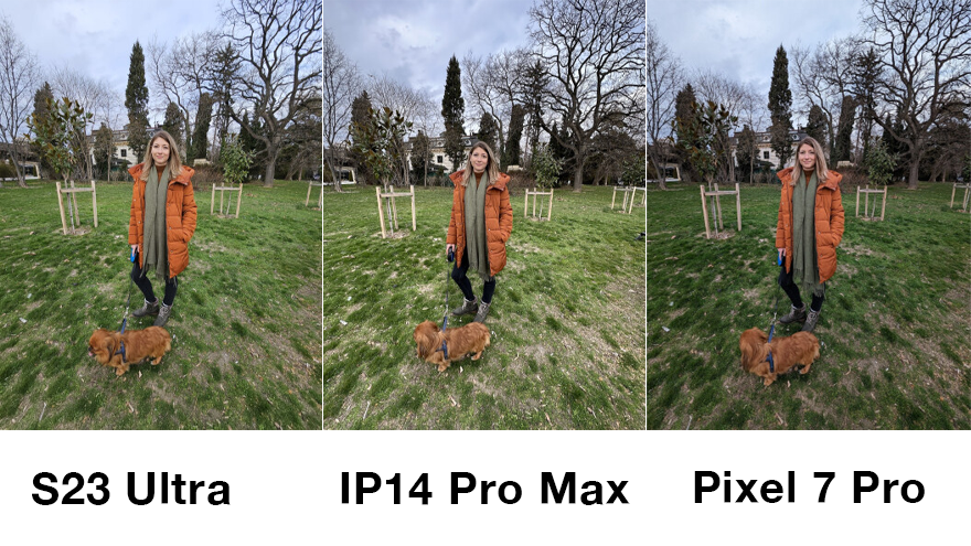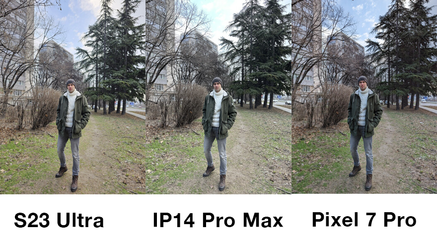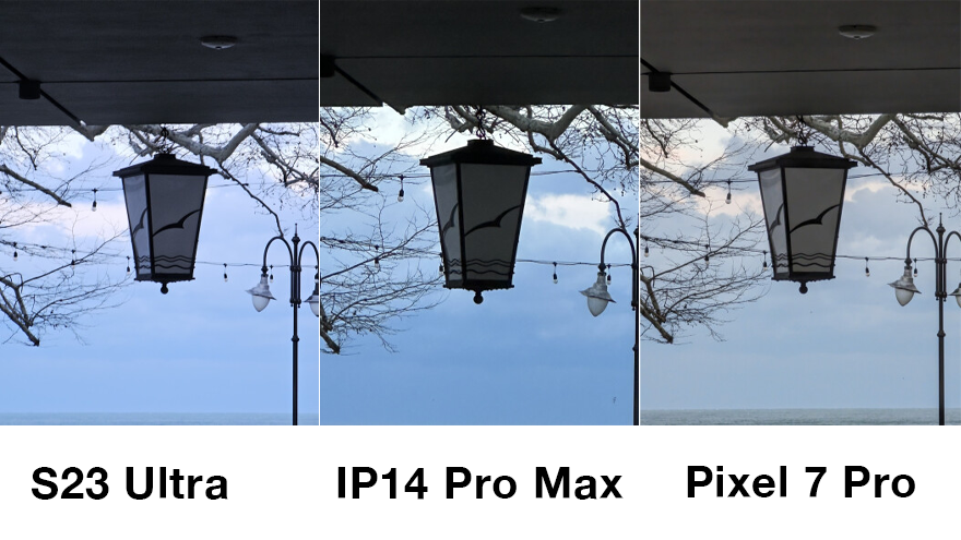 Vào ban ngày, cả ba điện thoại đều chụp được những bức ảnh đẹp, nhưng mỗi chiếc đều có nét riêng. Galaxy có màu sắc ấm hơn và bão hòa hơn so với hai loại còn lại và nó kém thực tế nhất trong ba loại. IPhone ưu tiên độ phơi sáng sáng hơn và có màu xanh lá cây lạnh hơn. Pixel thường có độ phơi sáng tối hơn với màu sắc rất nhạt và dải động cực lớn vì bạn có thể thấy rằng nó có nhiều màu nhất trên bầu trời.