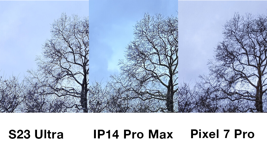 iPhone 14 Pro Max, chúng tôi nhận thấy tính năng làm sắc nét quá mức được áp dụng cho ảnh, nhiều hơn trên hầu hết các điện thoại khác. Galaxy cũng tăng cường độ sắc nét và mặc dù độ sắc nét không quá cao như trên iPhone, nhưng bạn sẽ nhận thấy quầng sáng xung quanh cành cây và các vật thể tương phản nhỏ khác trong ảnh. Pixel không gặp phải vấn đề đó.