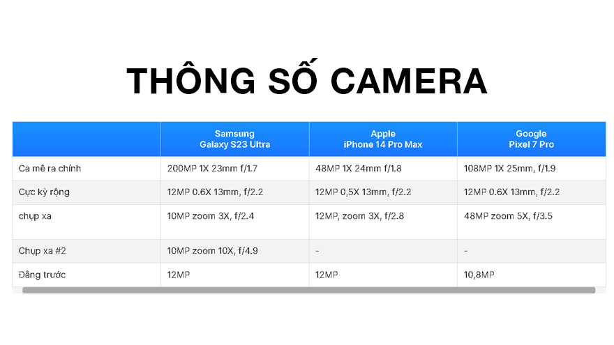 Ttrước khi vào phần so sánh, hãy xem nhanh về thông số máy ảnh của S23 Ultra và cách so sánh nó với hai thiết bị còn lại, iPhone 14 Pro Max và Pixel 7 Pro tại đây.