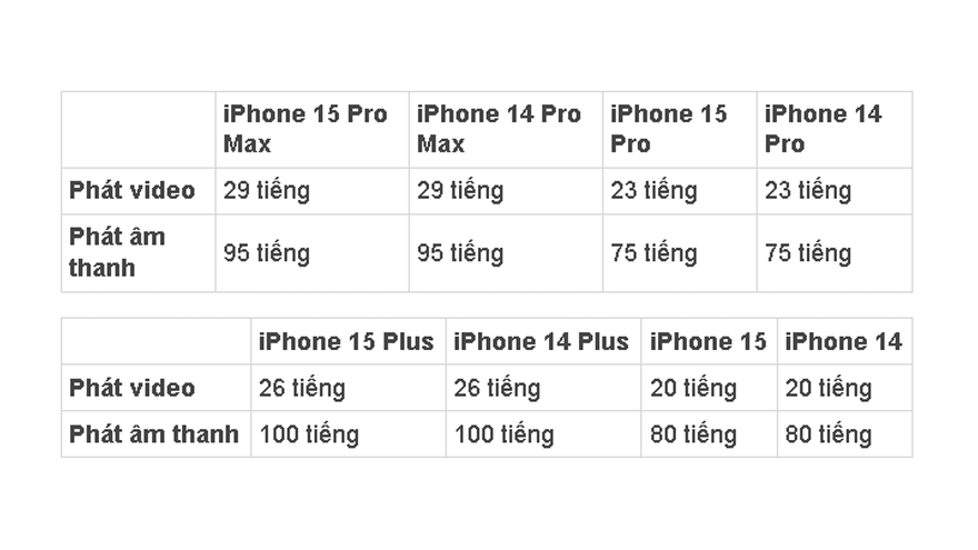Có thể thấy, dòng iPhone 15 có thời lượng pin không đổi so với dòng iPhone 14. Tuy nhiên, thời lượng pin thế này đã là quá tốt khi đủ sức phục vụ người dùng trong cả ngày dài.