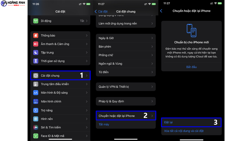 Bạn thực hiện thao tác giống trong hình. Nhấn vào Cài đặt chung. Tiếp theo là Chuyển hoặc đặt lại iPhone. Rồi nhấn Đặt lại là xong.