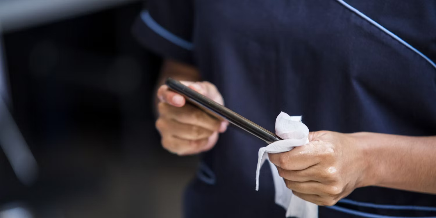 Mặc dù bạn có thể thử lau nhanh áo sơ mi hoặc một số loại vải khác, nhưng điều tốt nhất bạn nên làm là vệ sinh iPhone đúng cách . Sử dụng một miếng vải ẩm, không có xơ và lau nhẹ nhàng nhưng kỹ lưỡng vết bẩn theo một hướng.