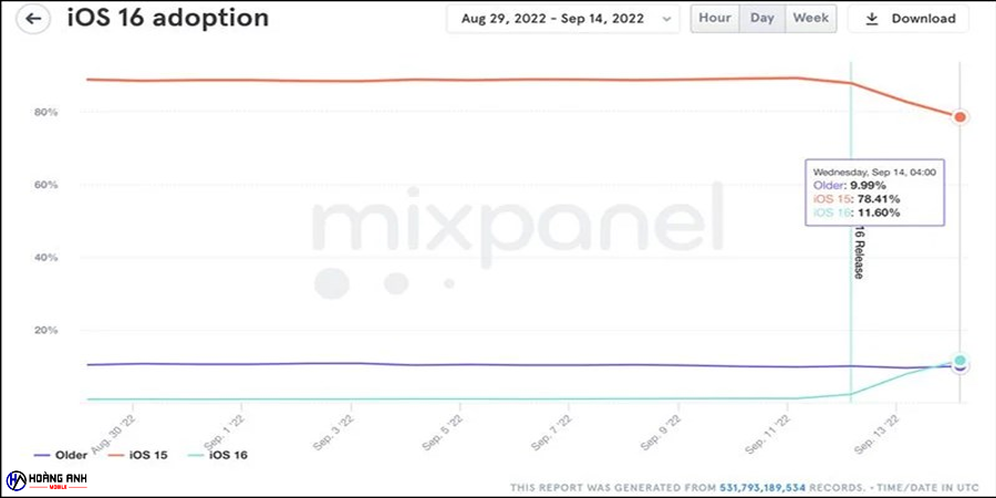 Apple đã phát hành bản cập nhật phần mềm mới nhất là iOS 16 vào ngày 12 tháng 9. Trong vòng 24 giờ kể từ khi được ra mắt, môt báo cáo cho biết có đến 6,71% người dùng iPhone trên toàn thế giới đã tải xuống bản cập nhật iOS 16. Theo như số liệu thống kê, thì tỷ lệ chấp nhận iOS 16 cao hơn khi đem đi so sánh với người tiền nhiệm là iOS 15, vốn có tỷ lệ chấp nhận là 6,48% sau một ngày phát hành. So sánh tỷ lệ sau ba ngày, iOS16 đạt 10,45%, trong khi iOS 15 là 9,68%. Rõ ràng iOS 16 đang được người dùng quan tâm đến.