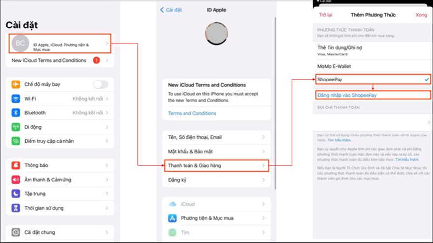 Để có thể thanh toán bằng ví Shoppe Pay. Bạn cần phải thêm phương thức mới như sau: Cài đặt > ID Apple, Icloud, phương tiện & mục mua > Thanh toán & giỏ hàng > ShoppePay > Đăng nhập. Việc tích hợp này được thực hiện trên cả tất cả thiết bị Apple chứ không riêng gì trên iPhone.
