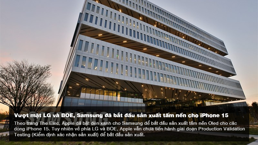 Theo trang The Elec, Apple đã bật đen xanh cho Samsung để bắt đầu sản xuất tấm nền Oled cho các dòng iPhone 15. Tuy nhiên về phía LG và BOE, Apple vẫn chưa tiến hành giai đoạn Production Validation Testing (Kiểm định xác nhận sản xuất) để bắt đầu sản xuất.