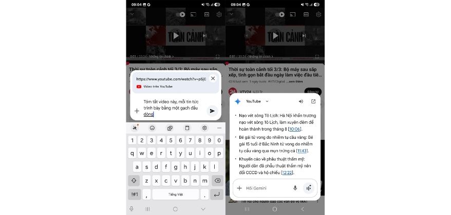 Tóm tắt video YouTube: Chỉ cần dán link, Gemini sẽ tự phân tích nội dung và trả về điểm chính + mốc thời gian.